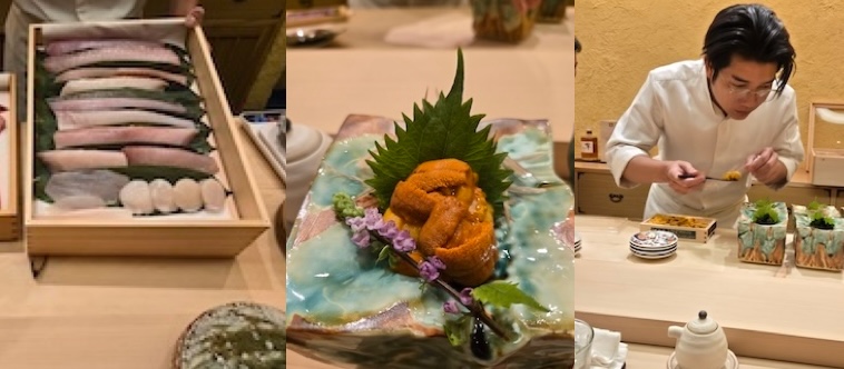 Considered one of the best restaurants in the world with three star Michelin, Kikunoi specialises in Kyoto Kaiseki cuisine the reflects the four seasons. We began with a poached red-pickled apricot bathed in a sea bream soft roe sauce. This was followed by an assortment of appetisers: bamboo shoot, squid, an unusual stalk, icefish sushi, rapini, fern heads, octopus with roe, lily bud petals with salmon roe and a mustard sesame seed dressed carrot. A sashimi of seasonal fish followed, then another sashimi of young blue fin tun with a magical mustard soy marinated egg yolk sauce, then we had a clam dumpling but what followed was one of the highlights of the evening: an whole abalone covered steamed in a cover of salt & seaweed which you push aside revealing the abalone with its liver sauce and sea urchin! Wow, what I could say! We then refreshen our palates with an assortment of salads. Followed by a hot pot with lobster, clam, sea bream, scallop and tofu. Steamed rice with sea bream and a cauliflower soup with Yuzu (Japanese lemon) fished our meal. We then had a choice of desserts: Toasted barley ice cream with rice cake and azuki bean paste or passion fruit sorbet in mango soup…….I tried both!